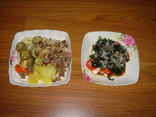 トマトが写っているほうの写真は、以前居酒屋で豆腐・トマト・わかめのサラダがあり、おいしいかったので妻が真似て作るようになった。